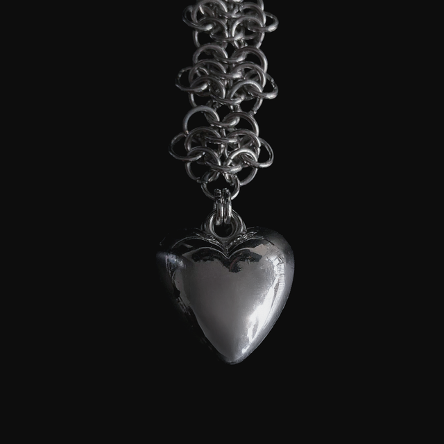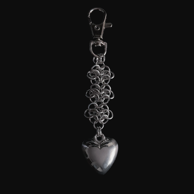 Brelok wykonany ręcznie w technice chainmaille z platynowych ogniw. Zakończony sercem w srebrnym kolorze, łączy w sobie nowoczesny styl i subtelną elegancję. Idealny jako dodatek do kluczy, torebki lub prezent dla bliskiej osoby.
