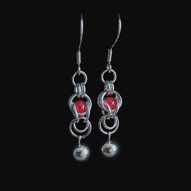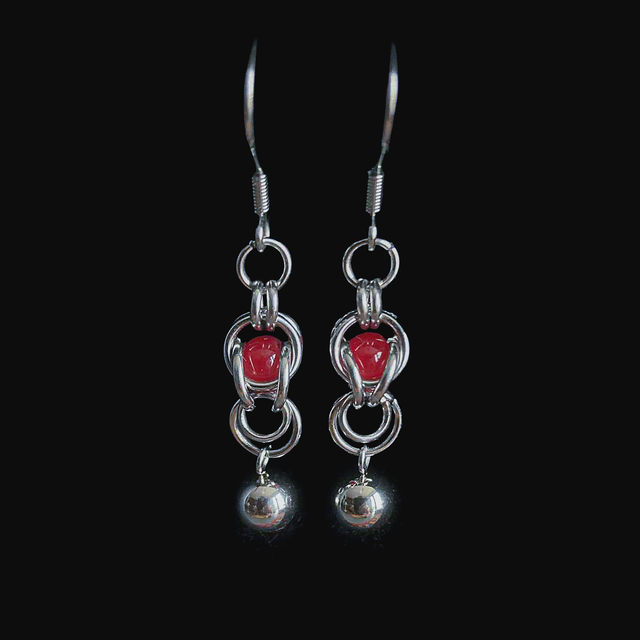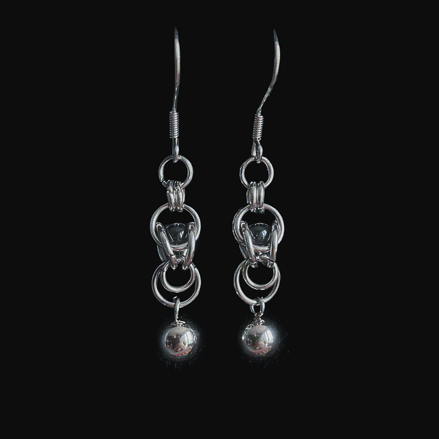 Te wyjątkowe kolczyki to subtelne połączenie precyzyjnego rękodzieła i współczesnego stylu. Wykonane ręcznie techniką chainmaille ze stali chirurgicznej, zachwycają trwałością, lekkością i elegancją. Centralnym punktem każdego kolczyka jest szklany koralik zamknięty w misternym splocie, uzupełniony błyszczącą, metalową kulką.
