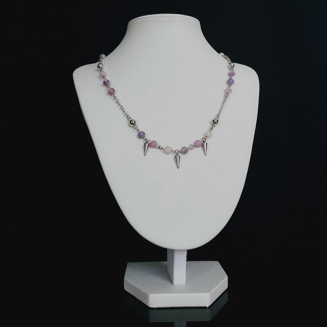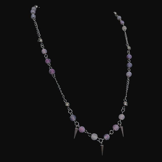 Ten naszyjnik łączy naturalny urok kamienia z wyjątkowym, surowym designem. Fioletowy agat trawiony ma ciekawą fakturę i kolor, które przyciągają uwagę. Dopełniają go stalowe kolce, które dodają całości odważnego charakteru.