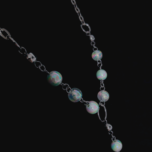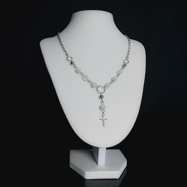 Naszyjnik z opalizującymi koralikami, platynowym łańcuszkiem i zawieszką w kształcie krzyża ze stali chirurgicznej to elegancki i subtelny element biżuterii, który doda wyjątkowego blasku każdej stylizacji. Opalizujące koraliki, delikatnie mieniące się w świetle, nadają naszyjnikowi magiczny i nowoczesny wygląd.